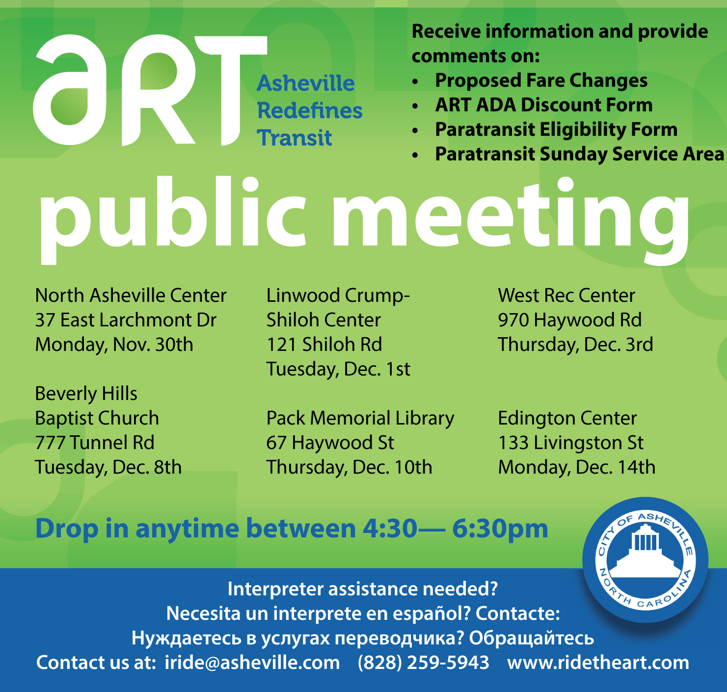 For questions about the meetings or proposed fare increases, call 828-259-5943 or email iride@ashevillenc.gov. For information about ART, including route information, visit www.ridetheart.com.